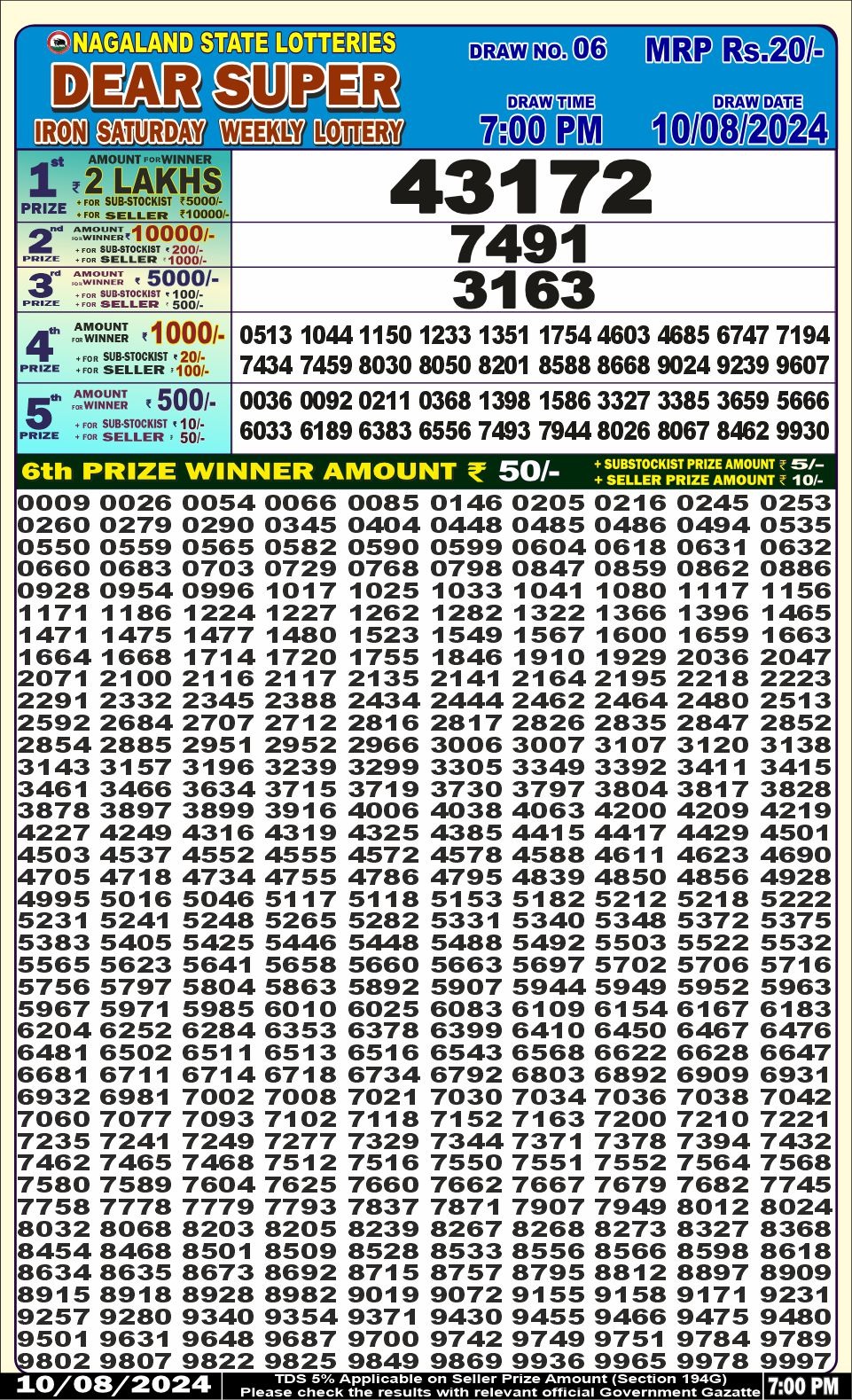 Dear super iron saturday weekly lottery 7pm result 10/08/24