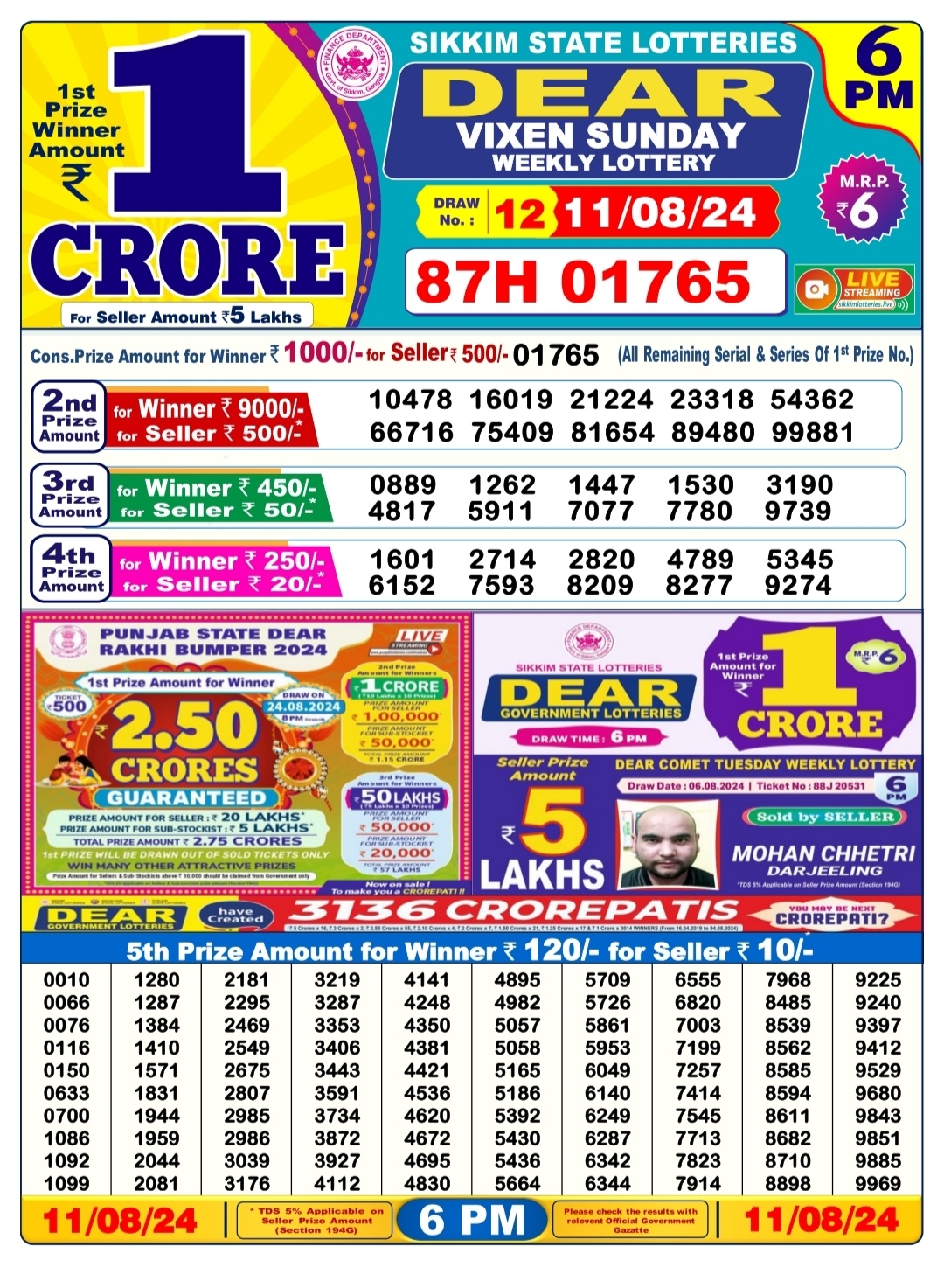 Dear vixen sunday weekly lottery 6pm result 11/08/24
