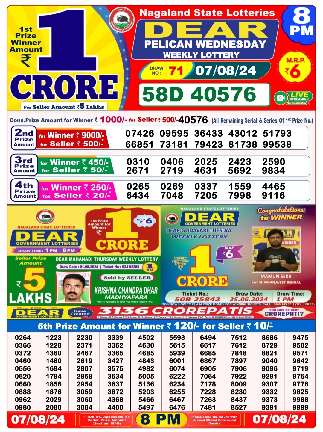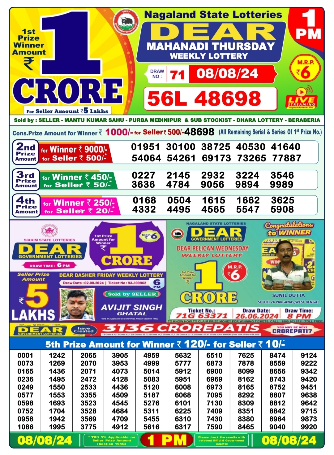 Dear mahanadi Thursday weekly lottery 1pm result 8/08/24