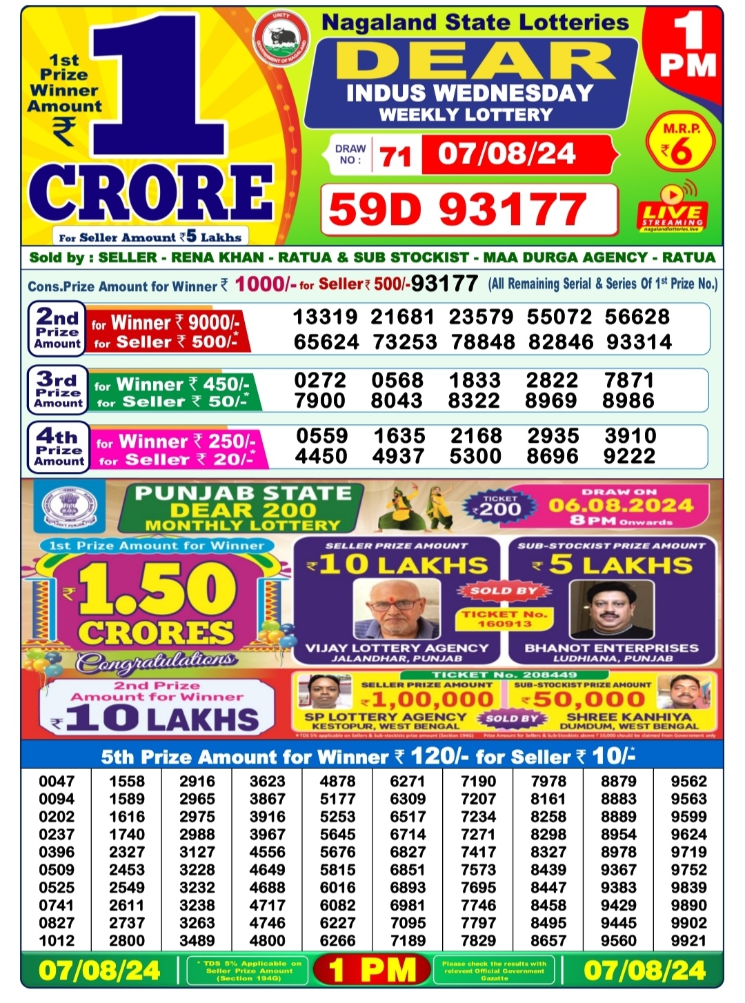 Dear indus Wednesday weekly lottery 1pm result 7/08/24