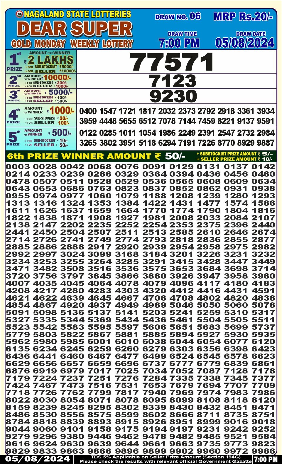 Dear super gold monday weekly lottery 7pm result 5/08/24