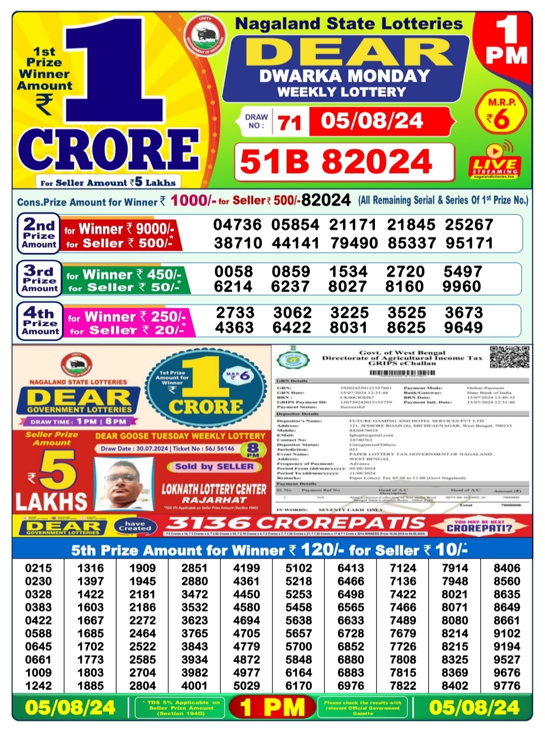 Dear dwarka monday weekly lottery 1pm result 5/08/24