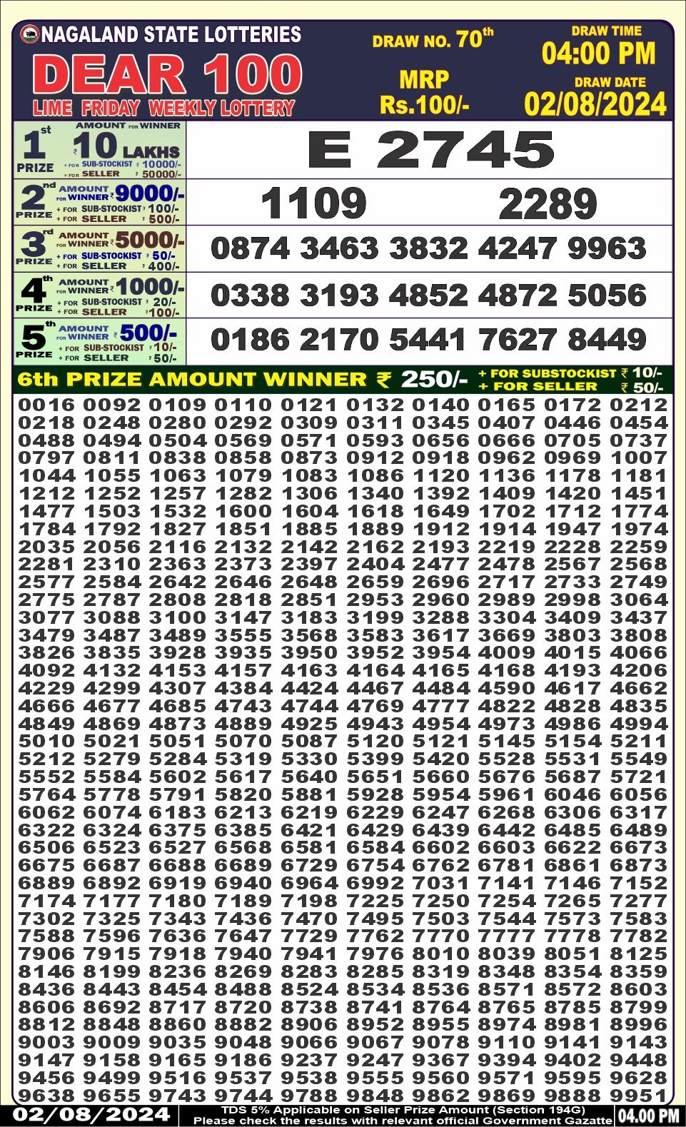 Dear100 lime Friday weekly lottery 4pm result 2/08/24