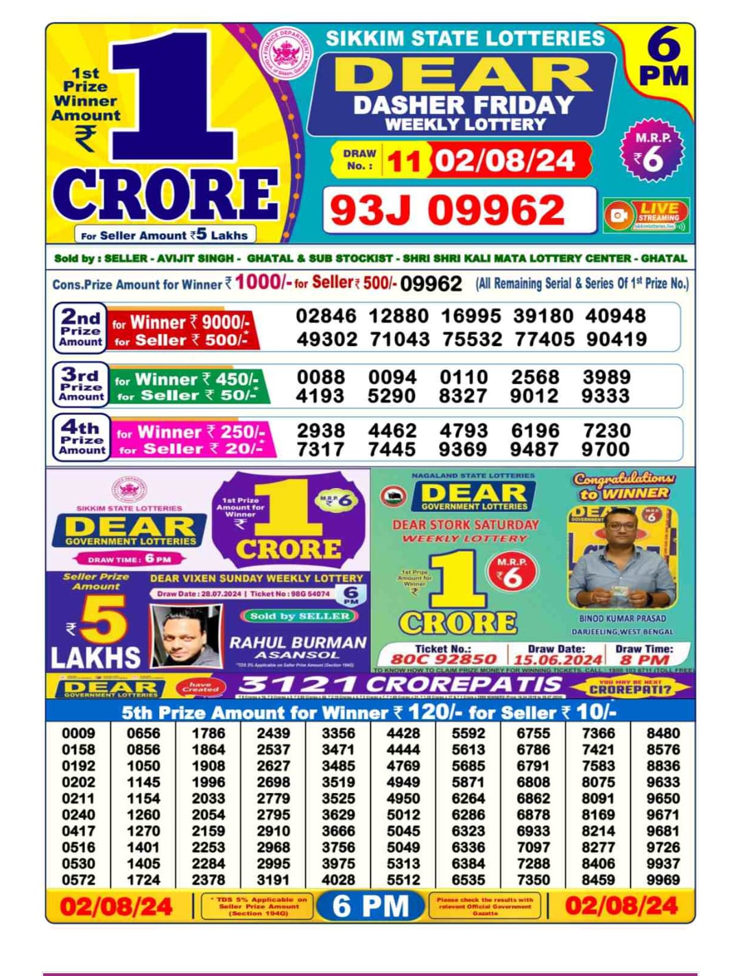 Dear dasher Friday weekly lottery 6pm result 2/08/24