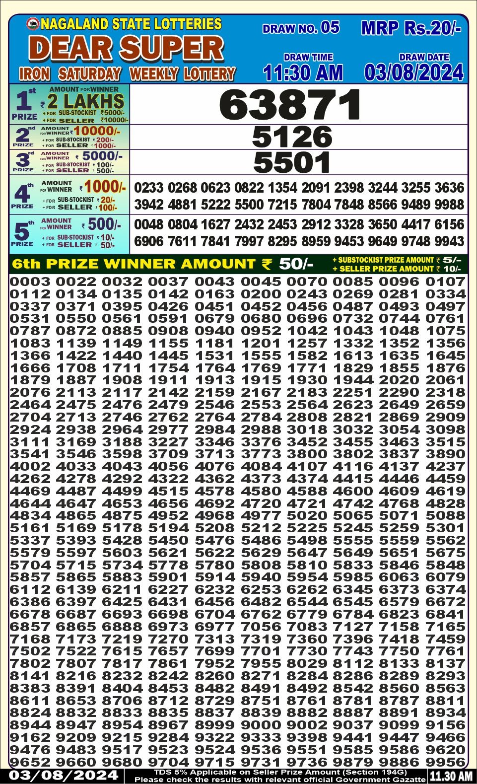 Dear super iron saturday weekly lottery 11.30am result 3/08/24