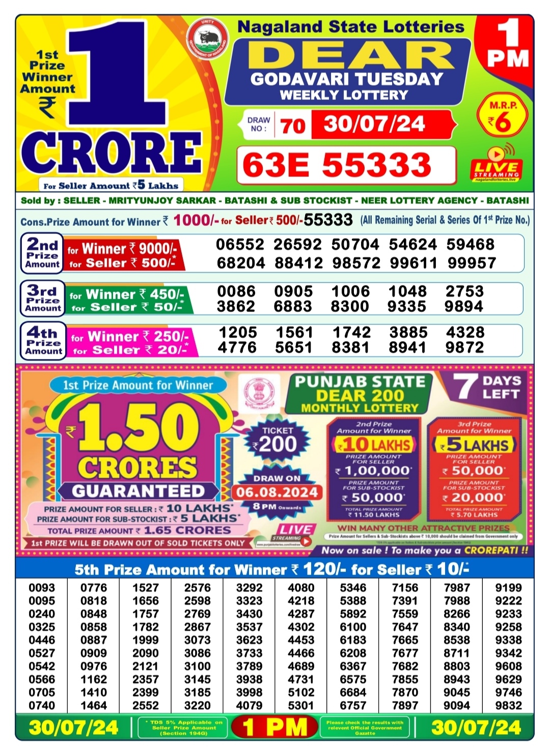 Dear godavari tuesday weekly lottery 1pm result 30/07/24