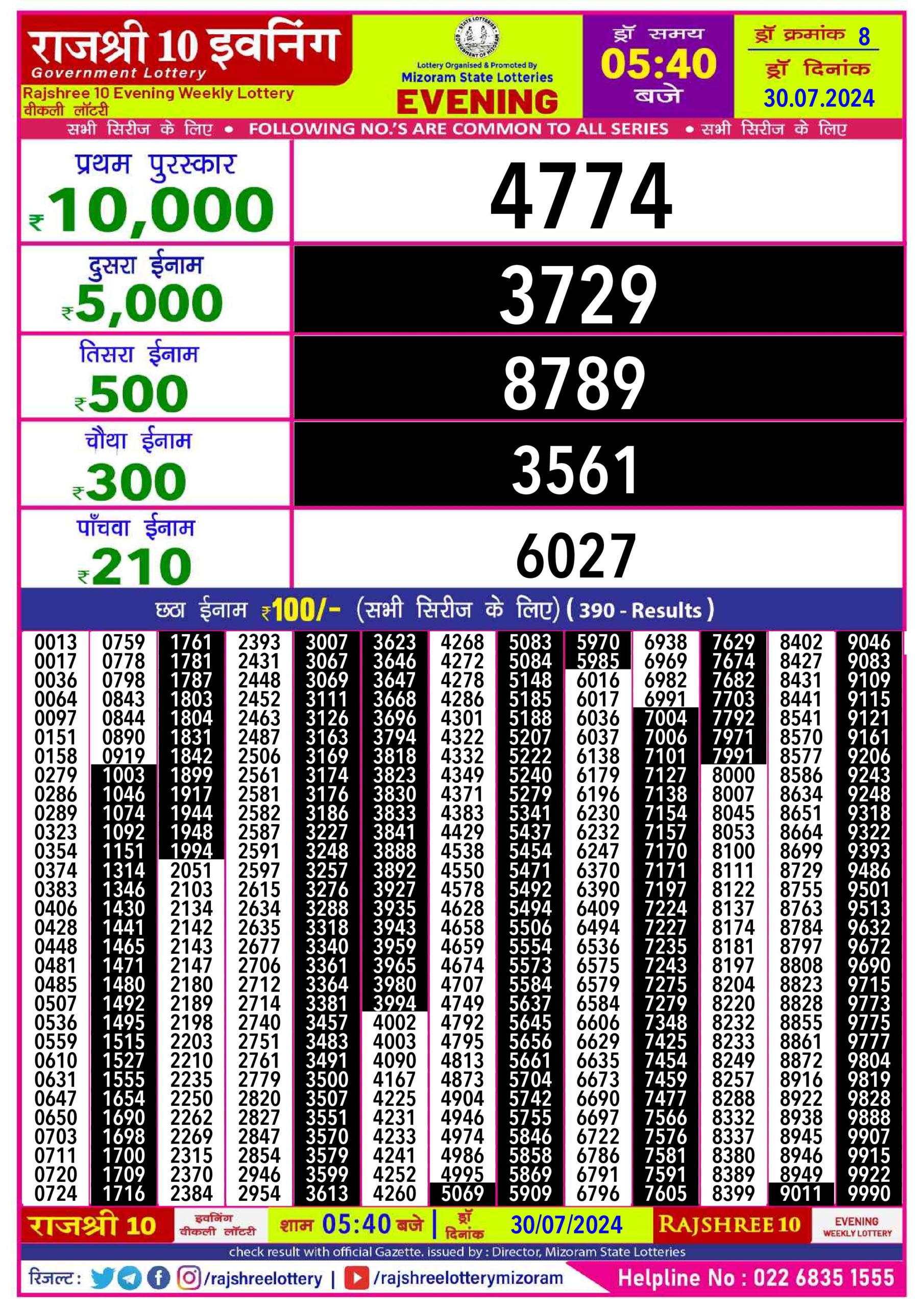 Labh laxmi charm tuesday weekly lottery 4pm result 30/07/24