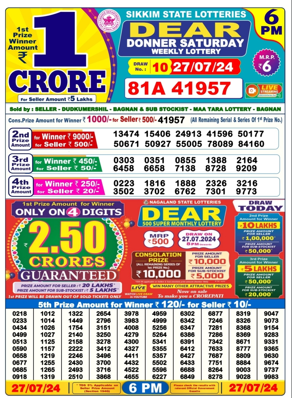 Dear donner saturday weekly lottery 6pm result 27/07/24