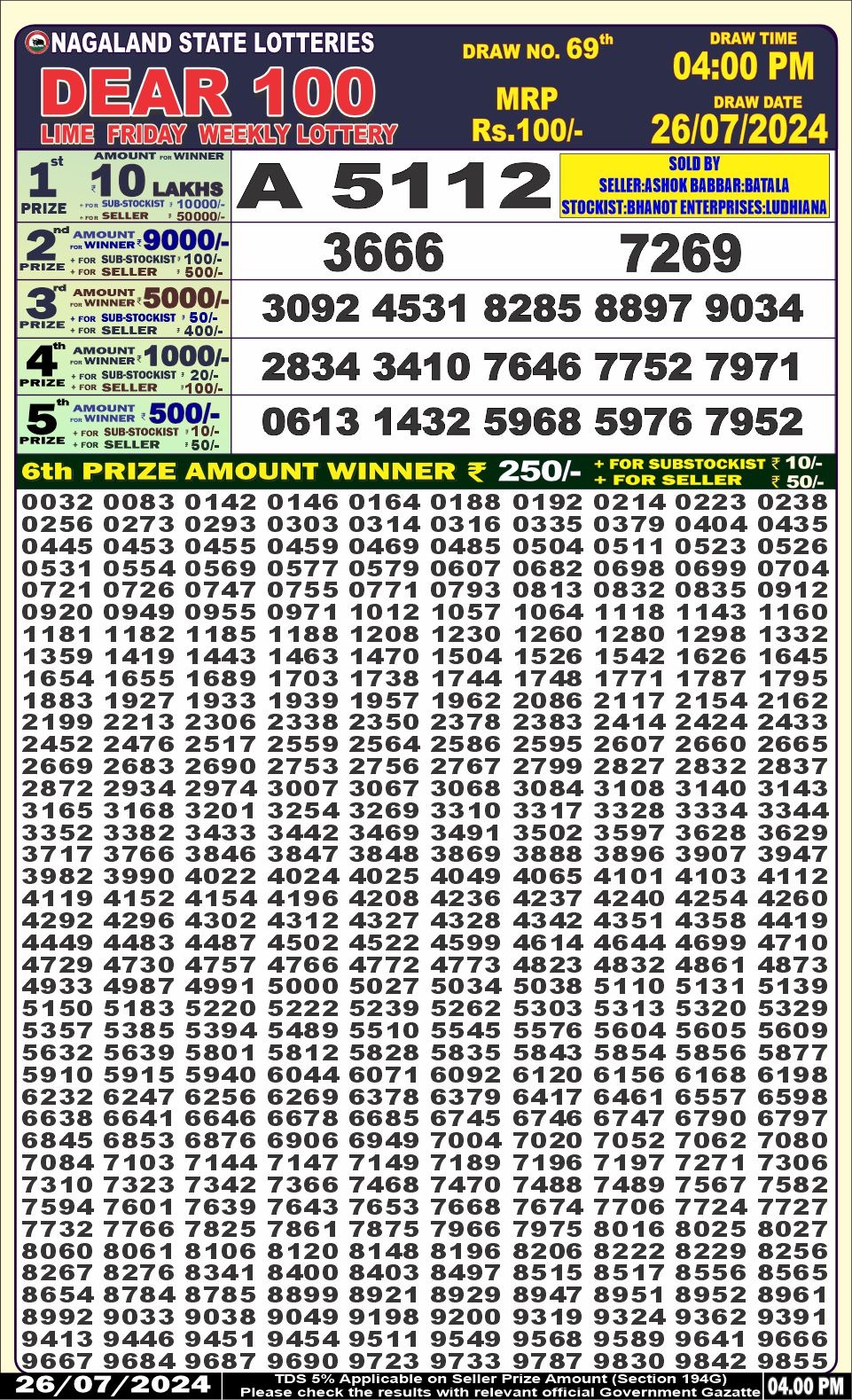 Dear100 lime Friday weekly lottery 4pm result 26/07/24