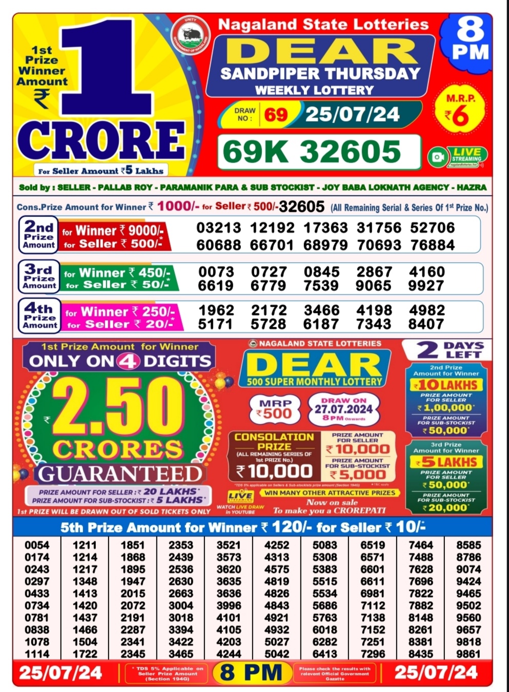Dear50 crimson Thursday weekly lottery 4pm result 25/07/24