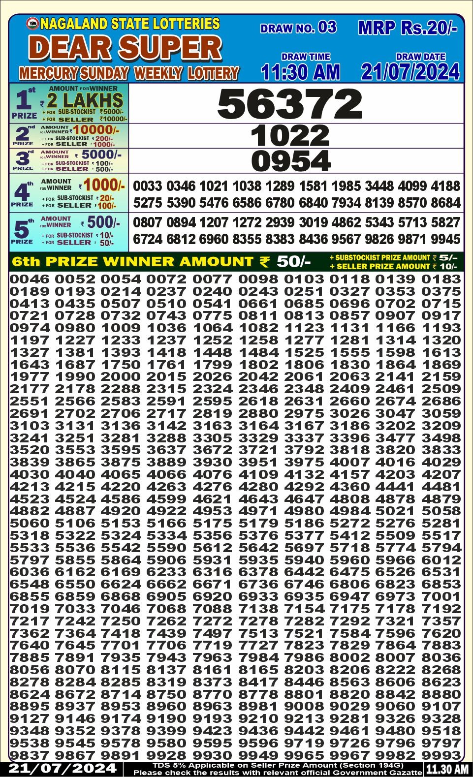 Dear super mercury sunday weekly lottery 11.30am result 21/07/24