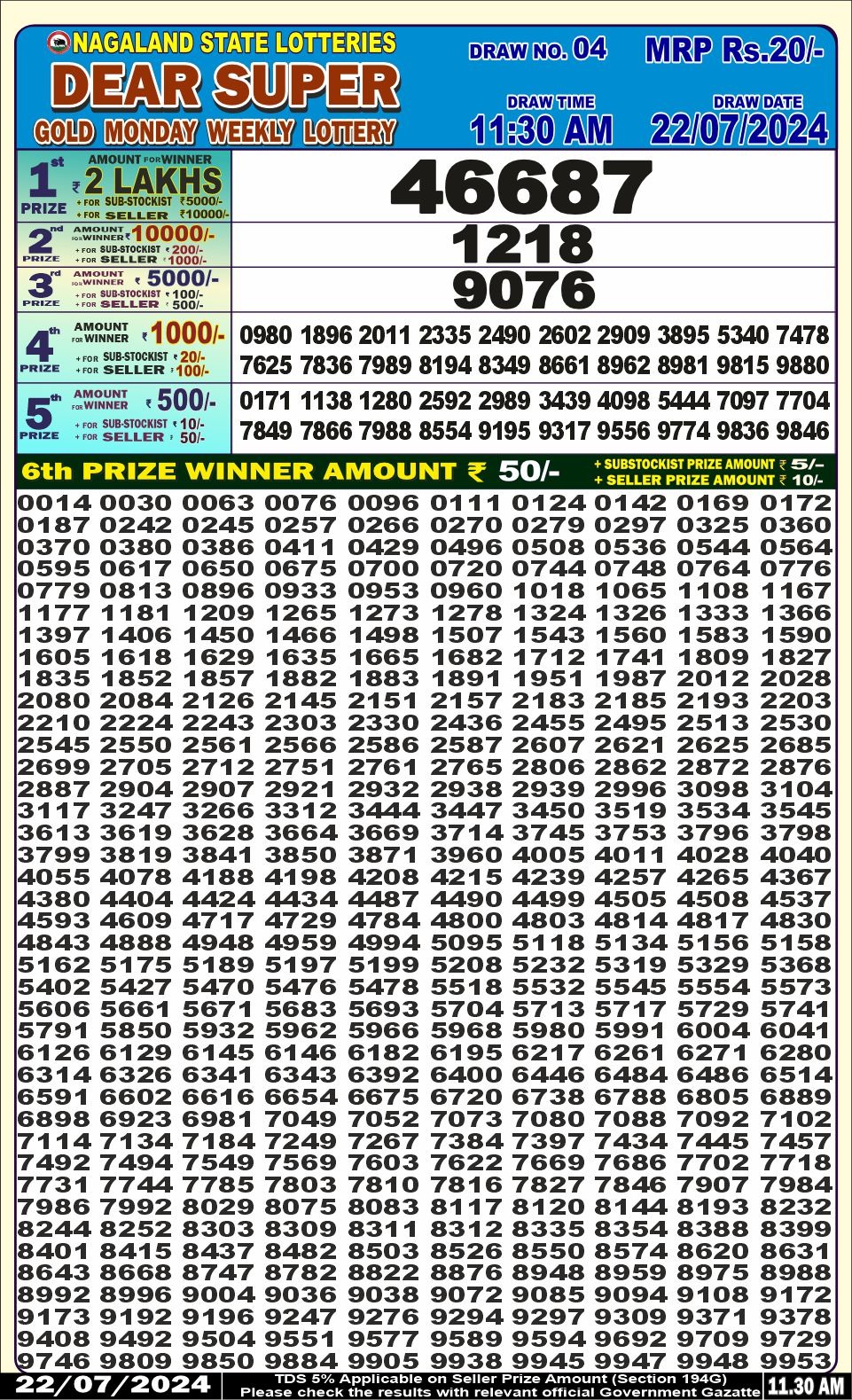 Dear super gold monday weekly lottery 11.30am result  22/07/24
