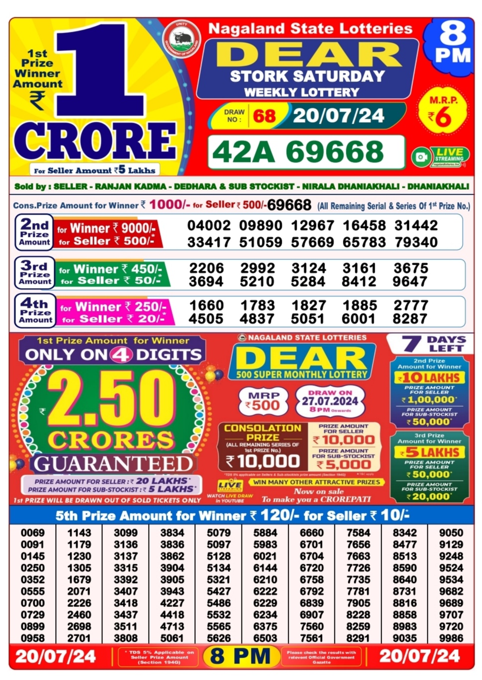 Dear stork saturday weekly lottery 8pm result 20/07/24