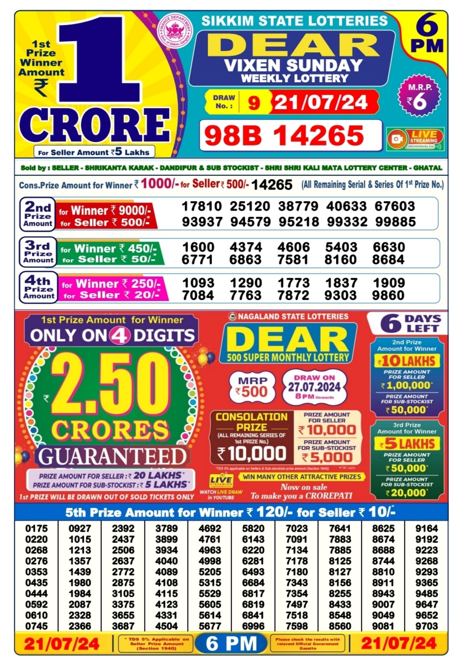 Dear vixen sunday weekly lottery 6pm result 21/07/24
