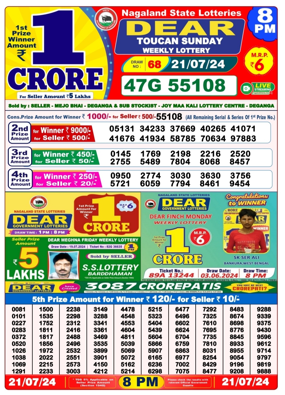 Dear10 wonder sunday weekly lottery 7pm result 21/07/24