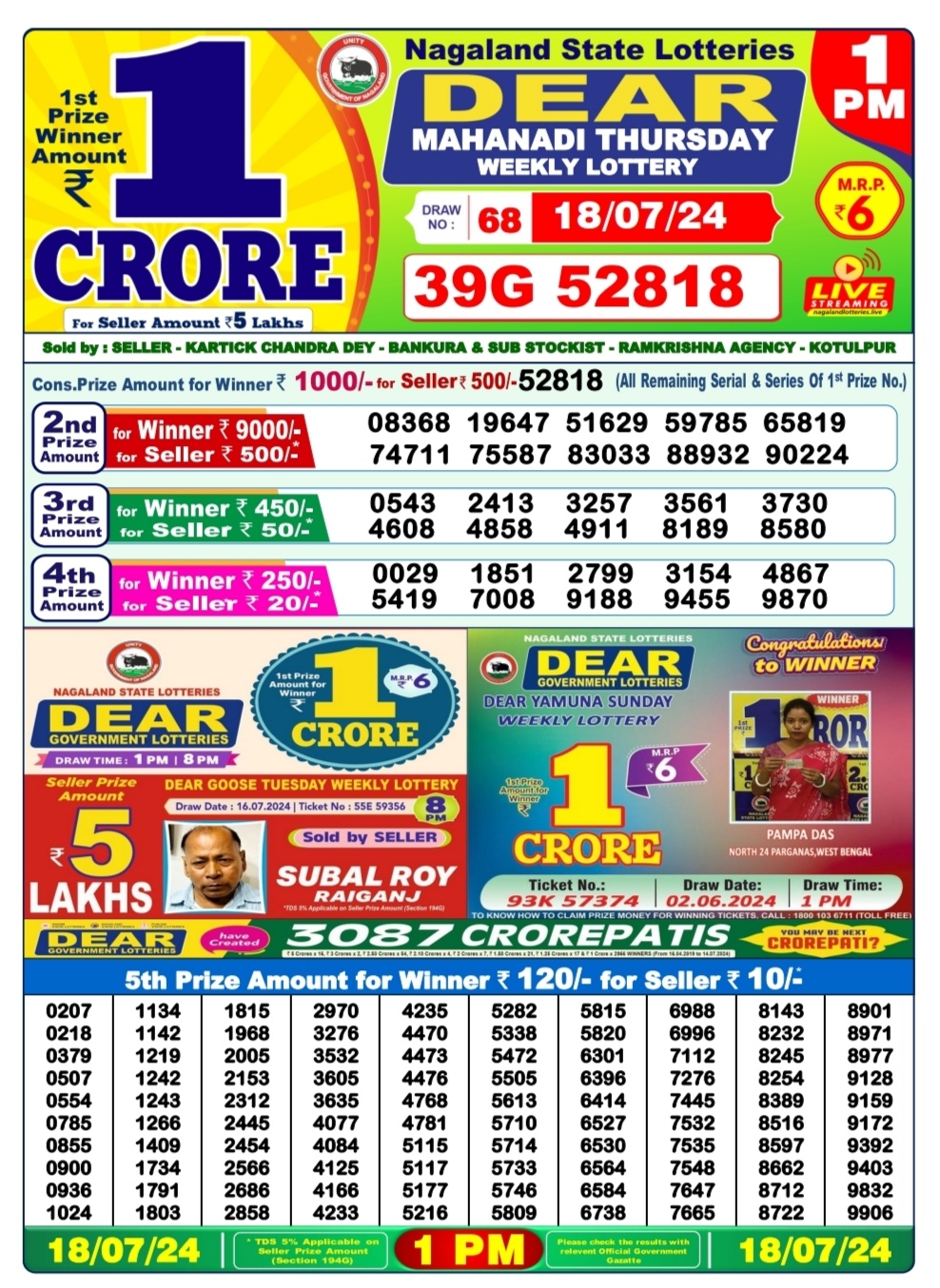 Dear mahanadi Thursday weekly lottery 1pm result 18/07/24