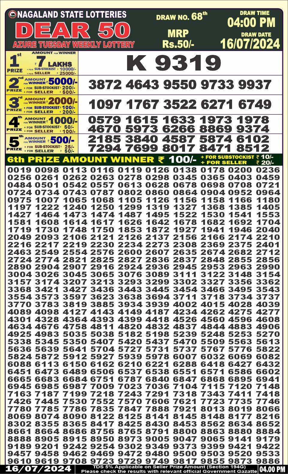 Dear50 azure tuesday weekly lottery 4pm result 16/07/24