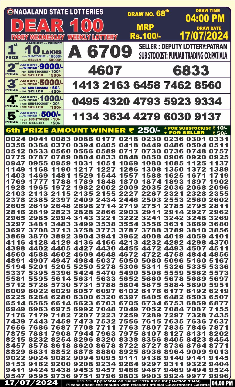 Dear100 ivory Wednesday weekly lottery 4pm result 17/07/24