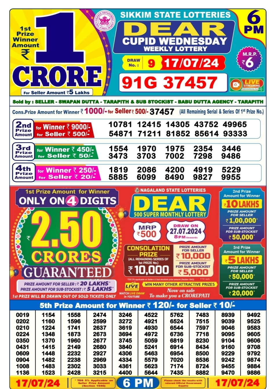 Dear10 solid Wednesday weekly lottery 7pm result 17/07/24