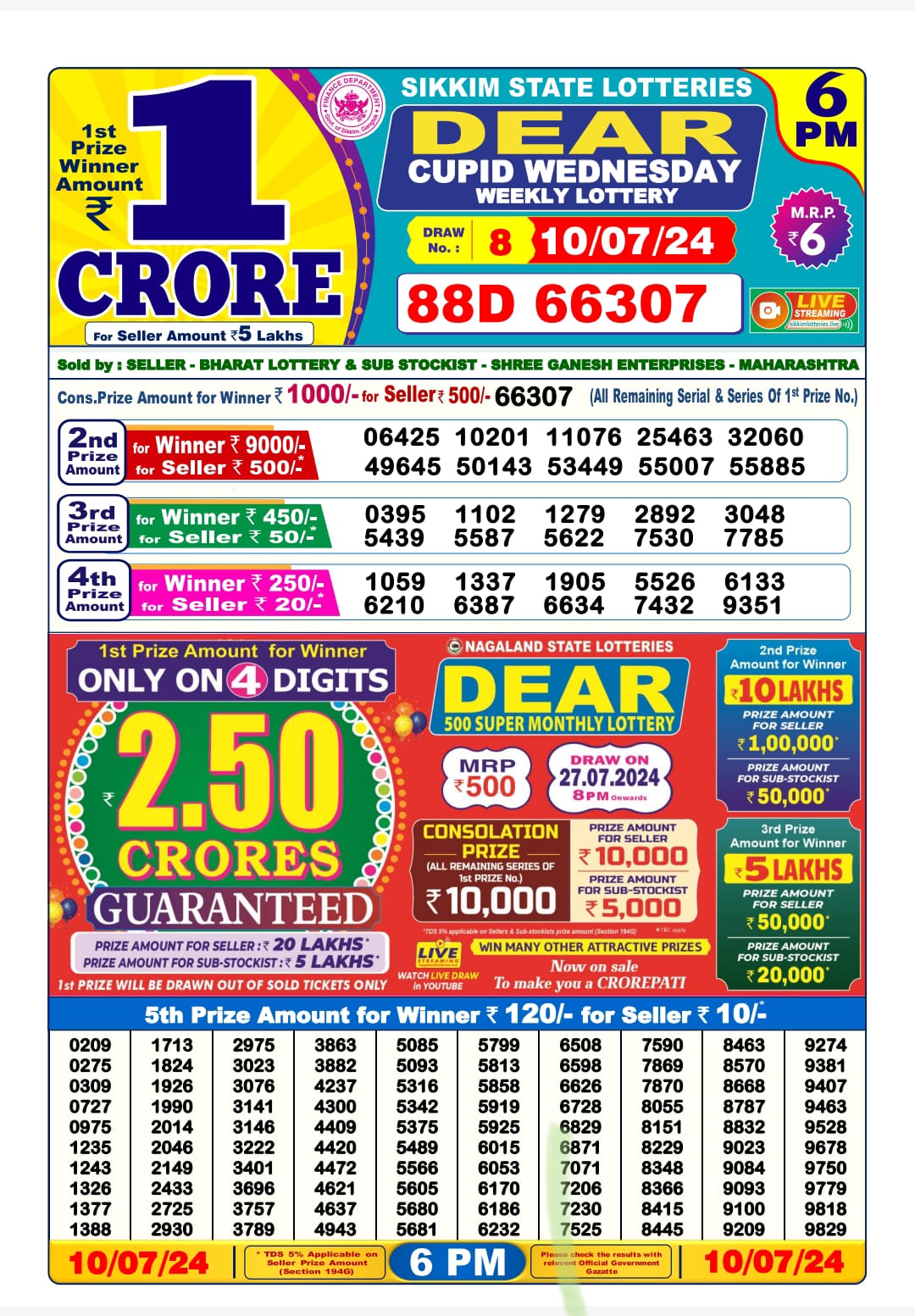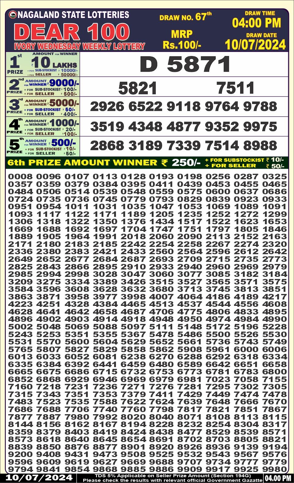 Dear10 solid Wednesday weekly lottery 7pm result 10/07/24