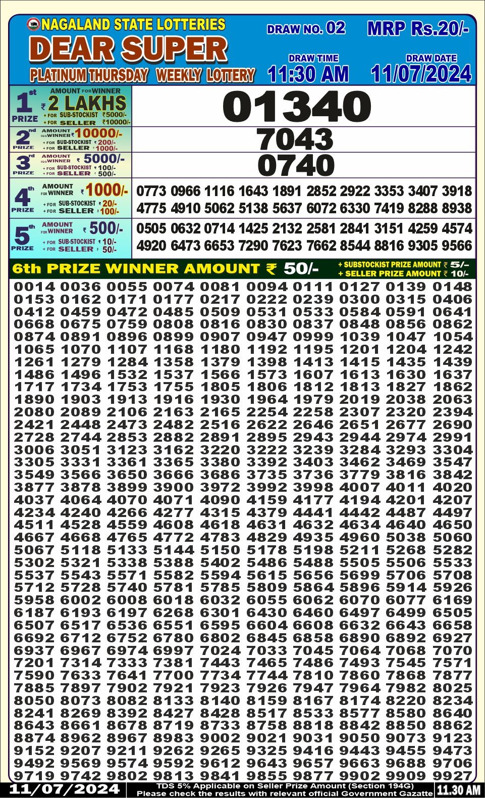 Dear super platinum Thursday weekly lottery 11.30am result 11/07/24