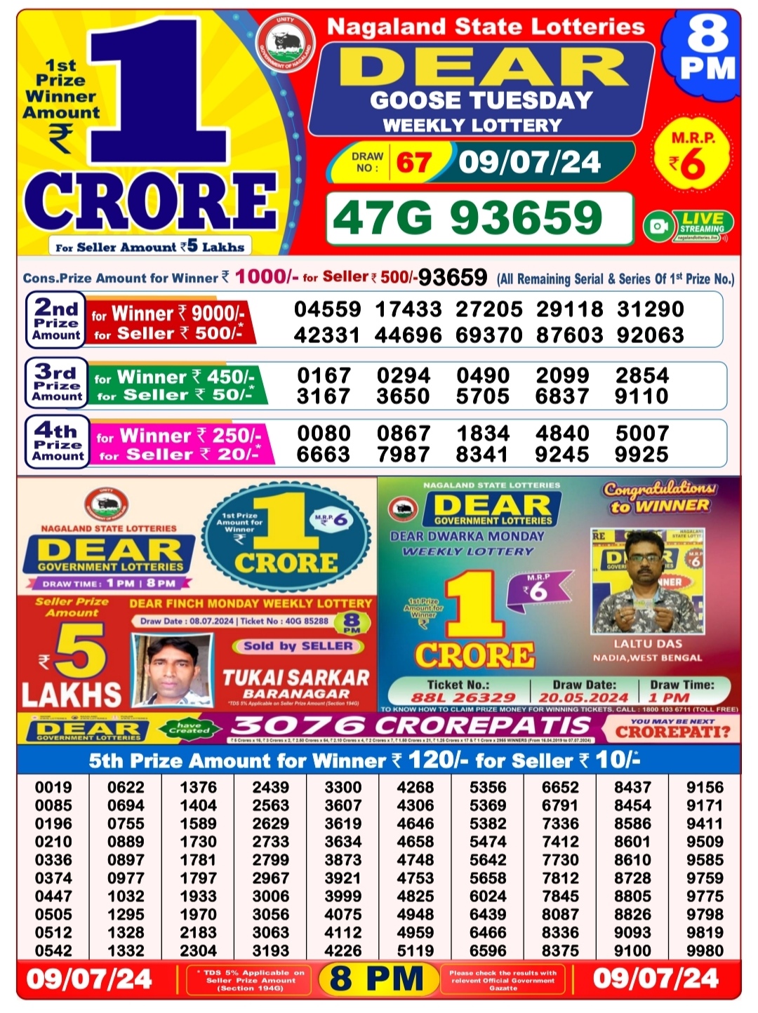 Dear goose tuesday weekly lottery 8pm result 9/07/24