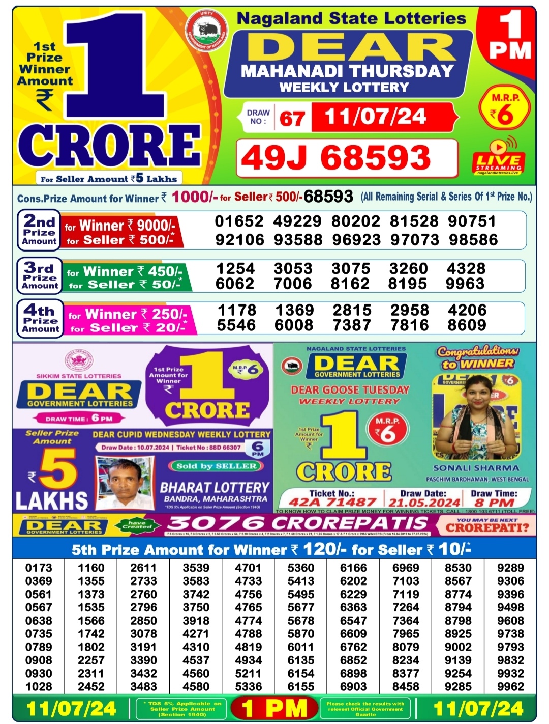 Dear mahanadi Thursday weekly lottery 1pm result 11/07/24