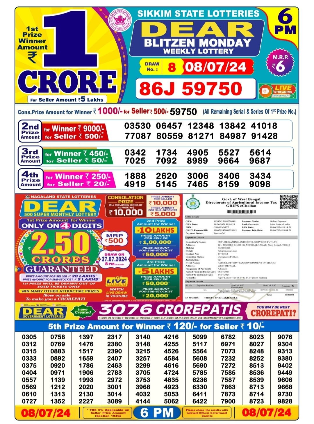 Dear blitzen monday weekly lottery 6pm result 8/07/24