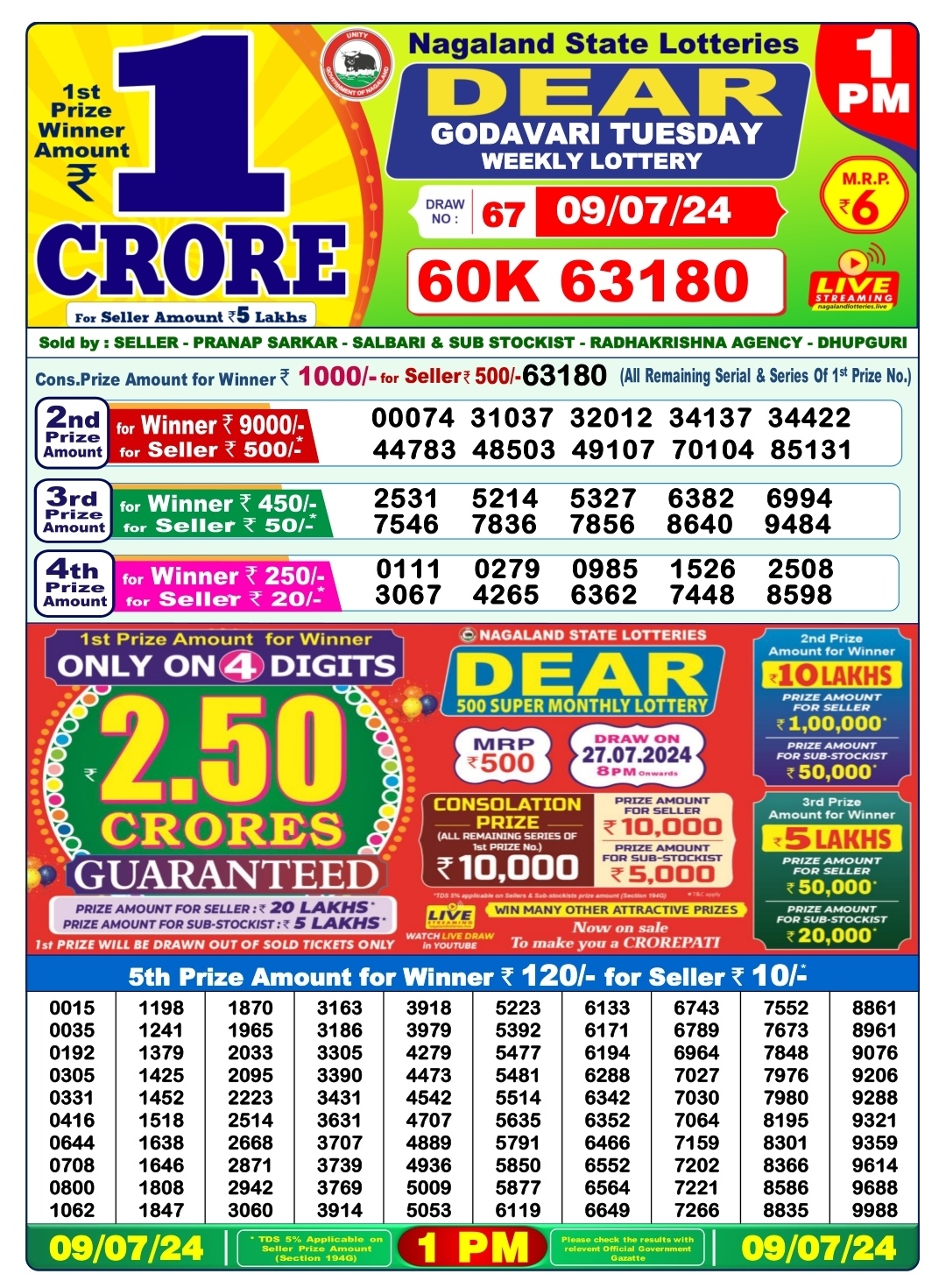 Dear godavari tuesday weekly lottery 1pm result 9/07/24