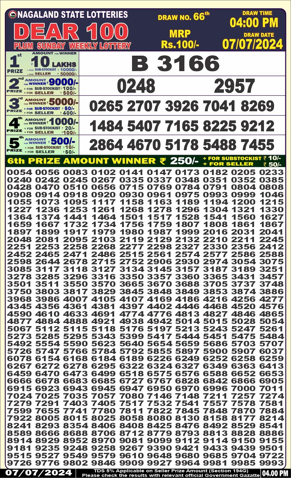 Dear100 plum sunday weekly lottery 4pm result 7/07/24