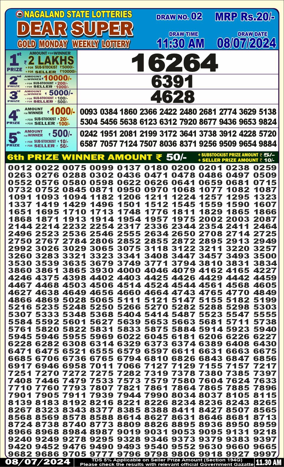 Dear super gold monday weekly lottery 11.30am result 8/07/24