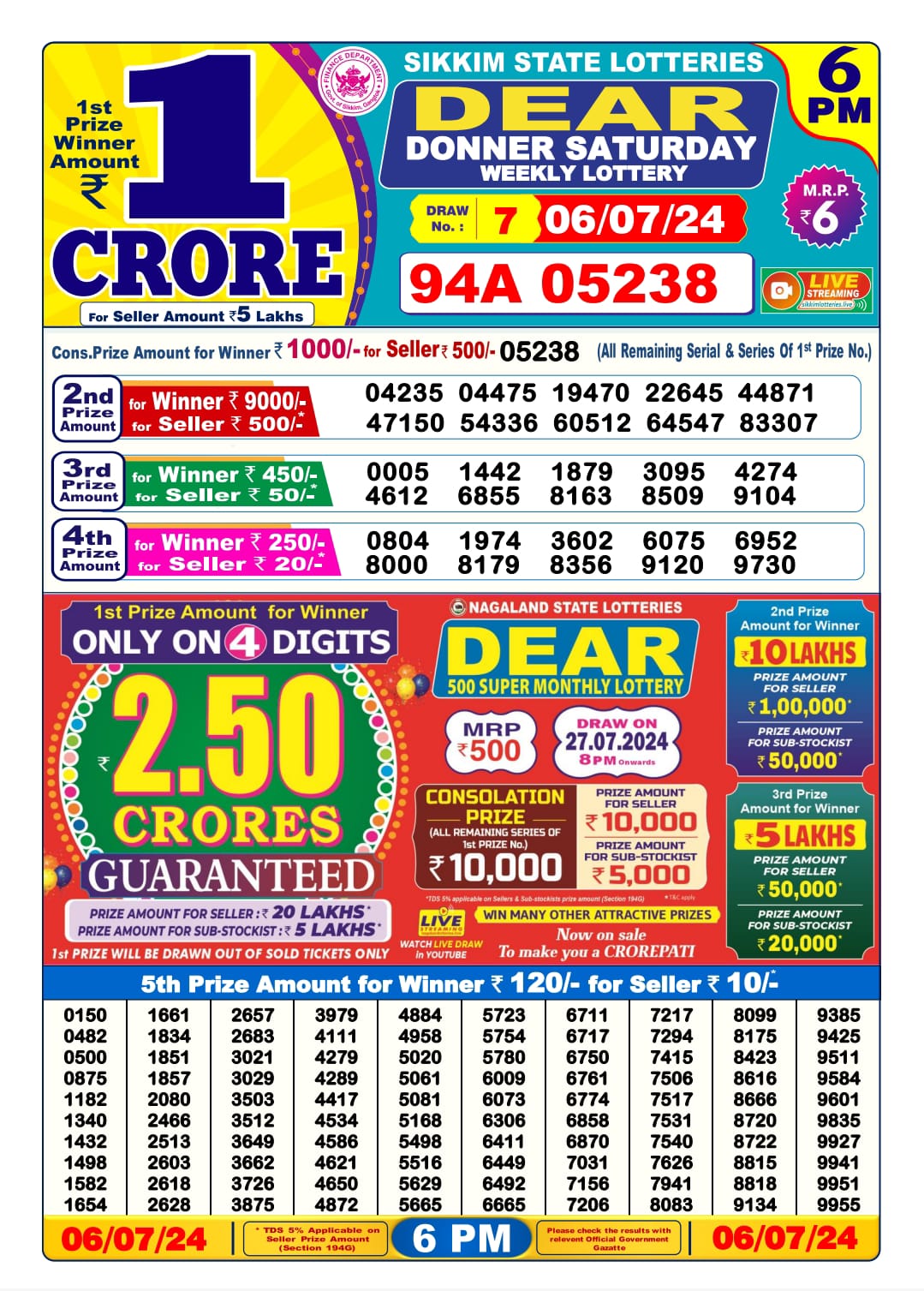Dear donner saturday weekly lottery 6pm result 6/07/24