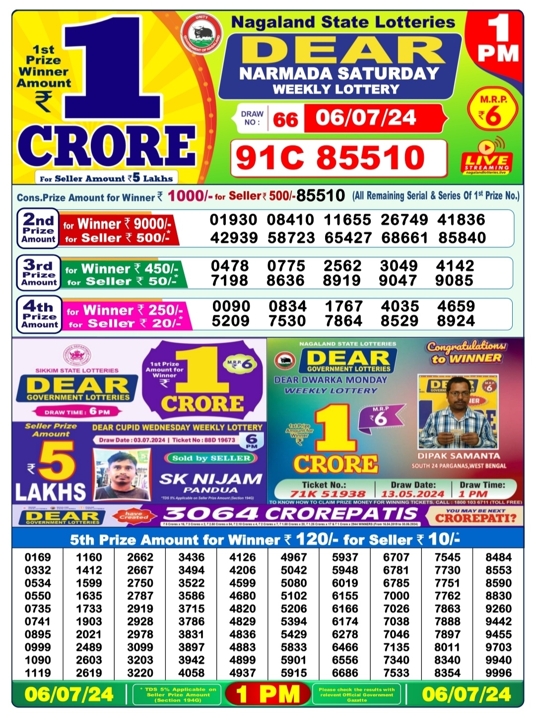 Dear narmada saturday weekly lottery 1pm result 6/07/24