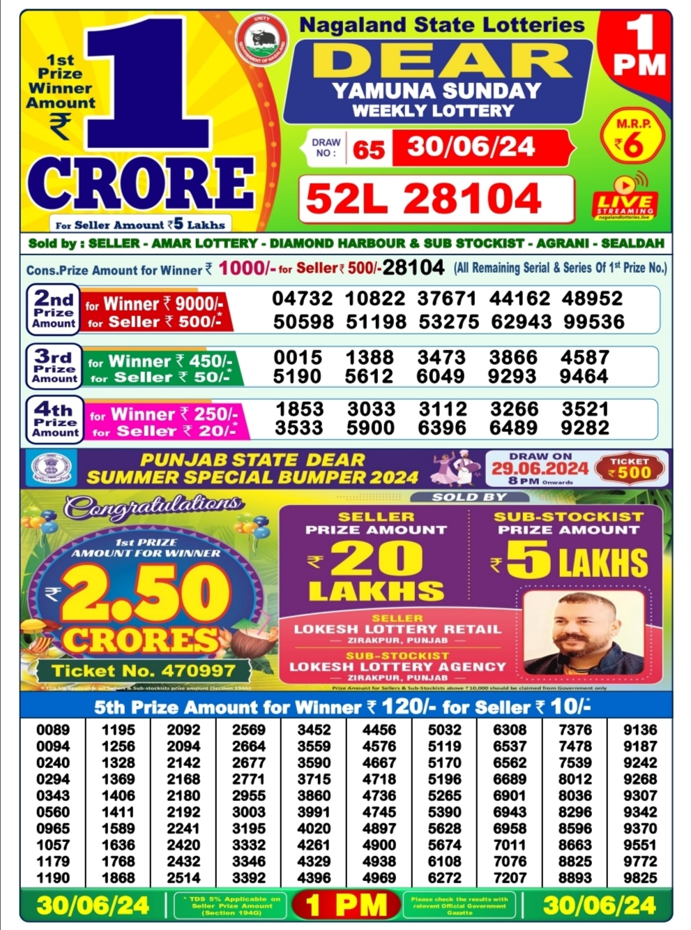 Dear yamuna sunday weekly lottery 1pm result 30/06/24