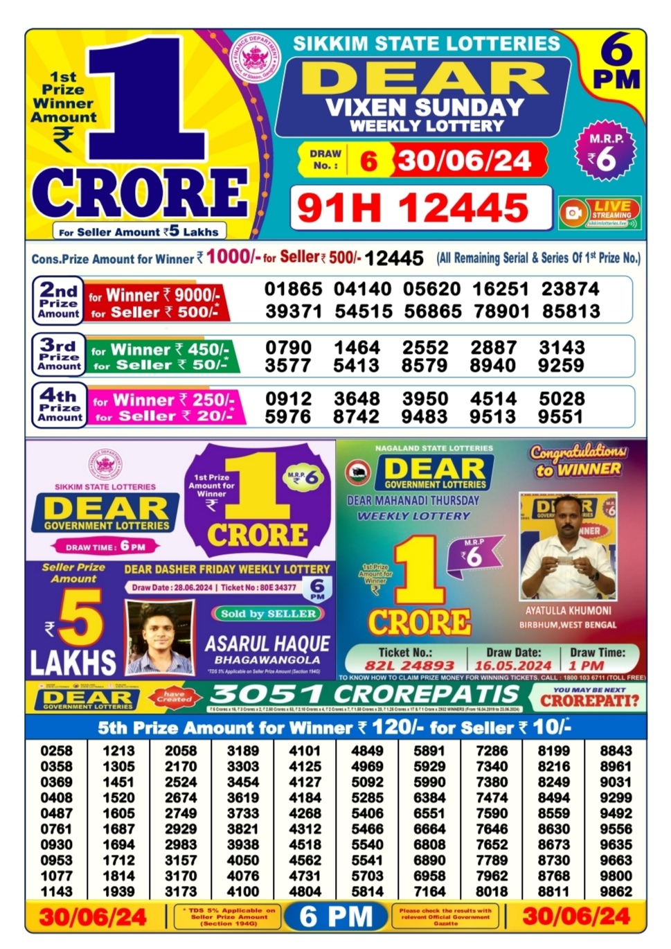 Dear vixen sunday weekly lottery 6pm result  30/06/24