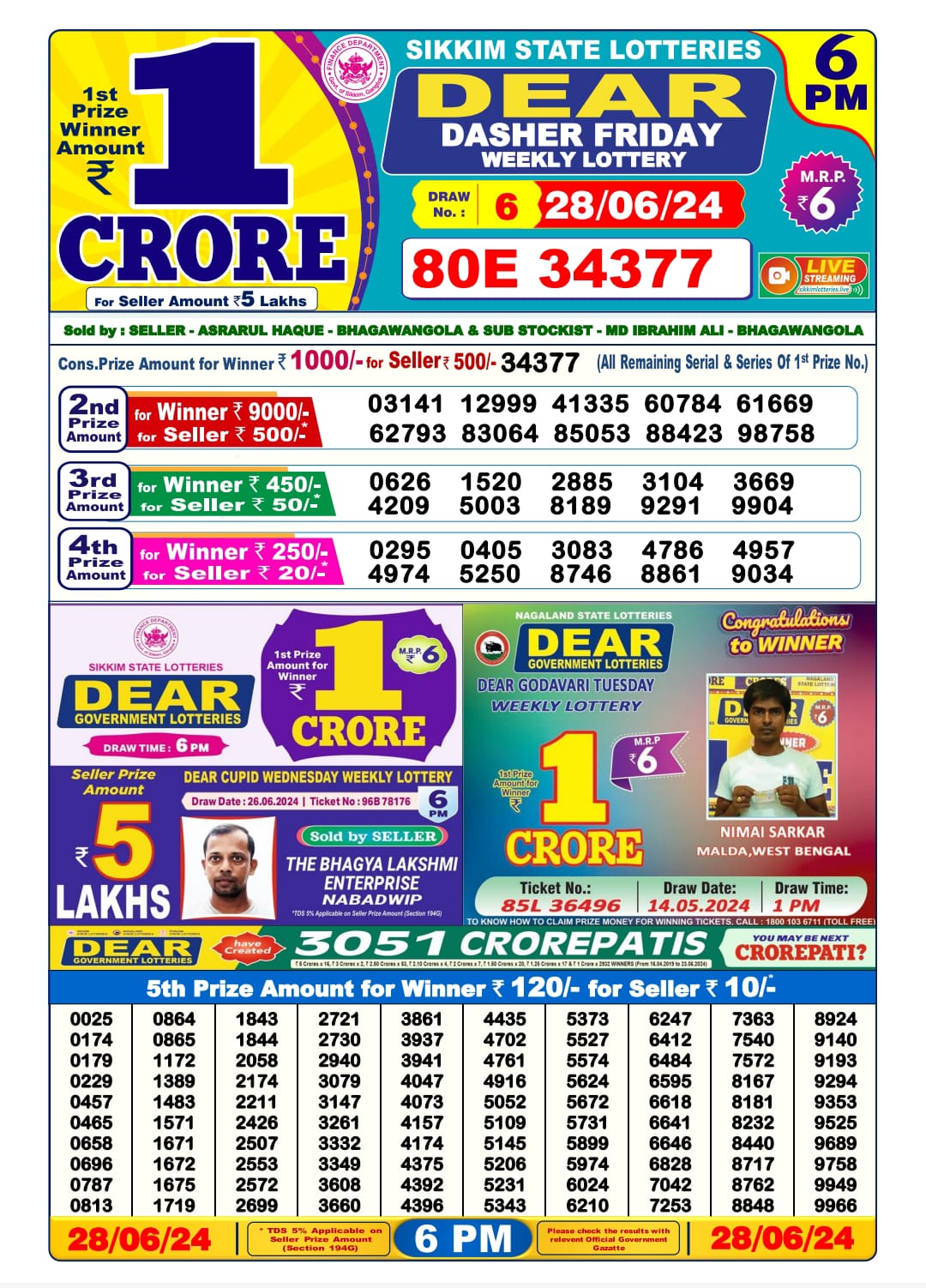Dear10 super Friday weekly lottery 7pm result 28/06/24