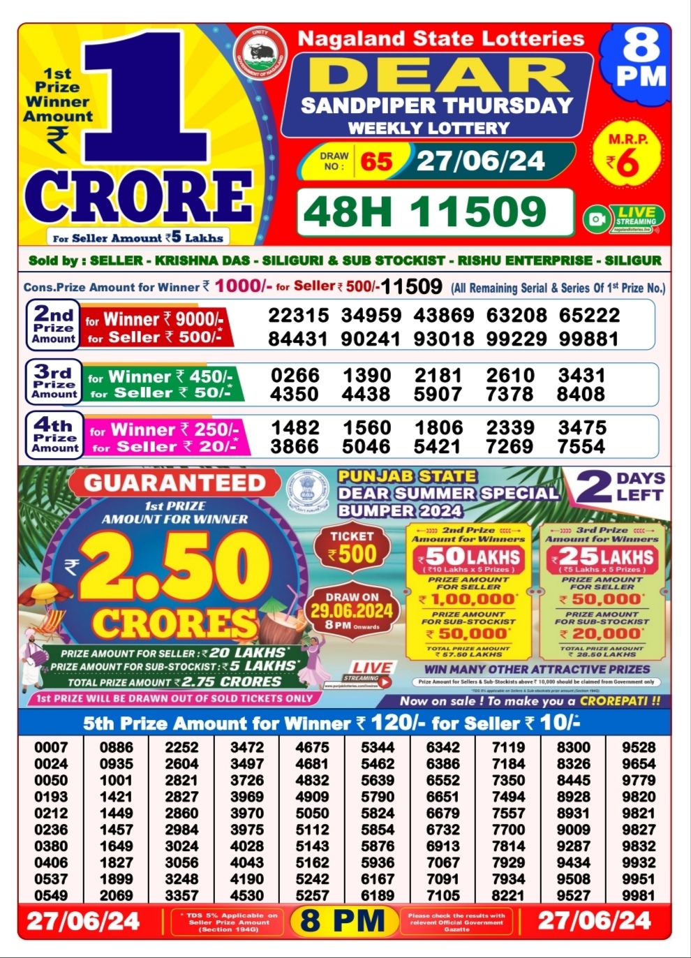 Dear sandpiper Thursday weekly lottery 8pm result 27/06/24