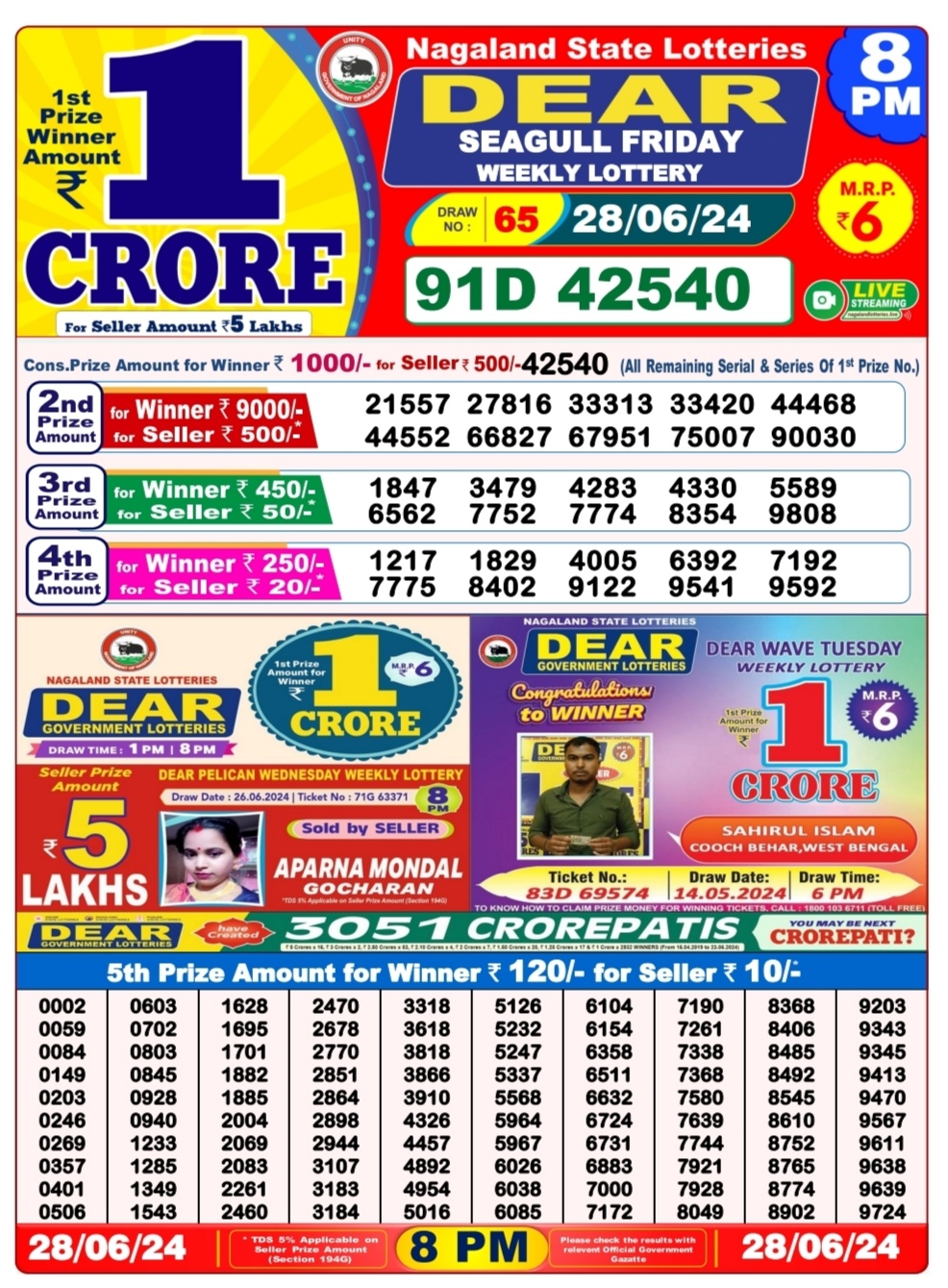 Dear seagull Friday weekly lottery 8pm result 28/06/24