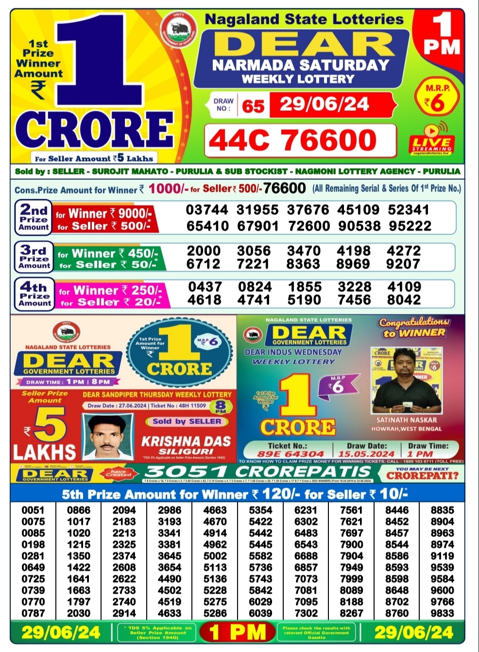 Dear narmada saturday weekly lottery 1pm result 29/06/24