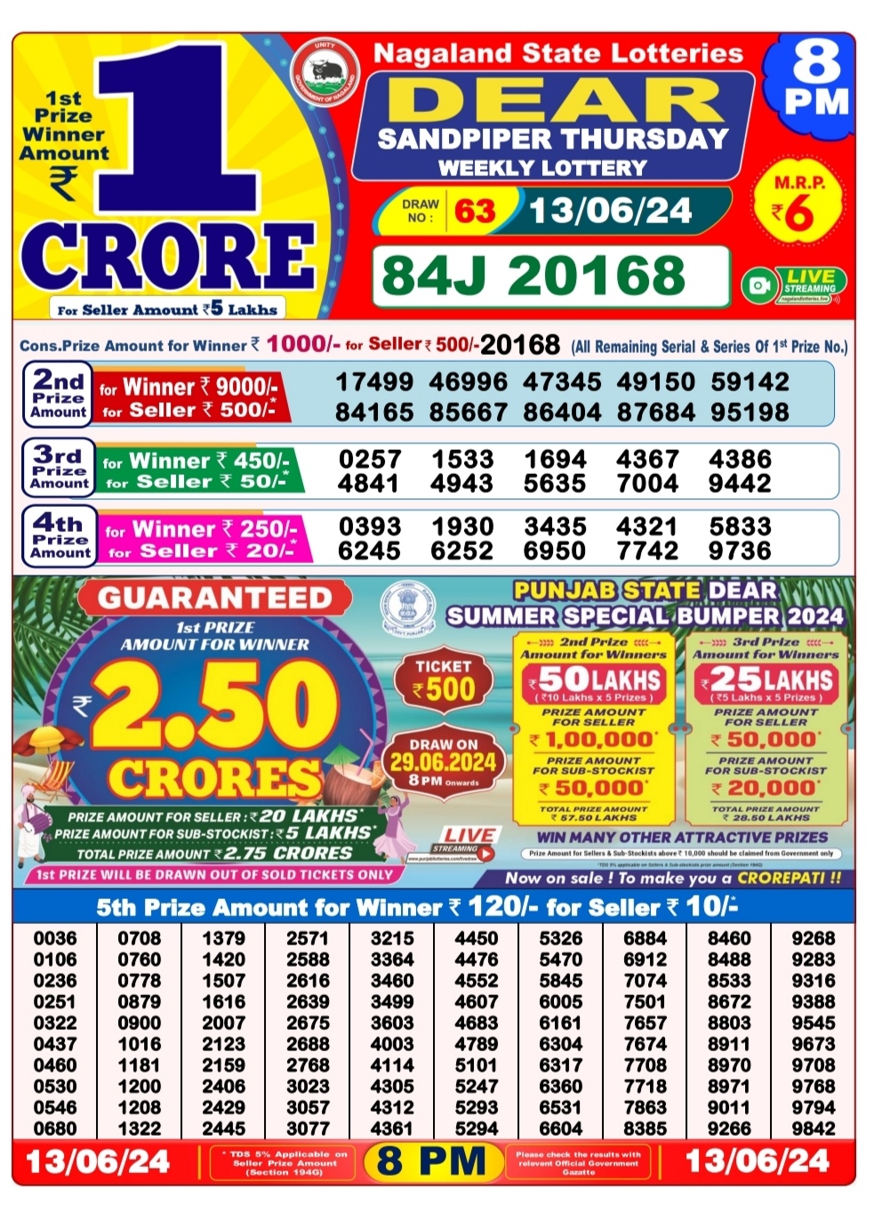 Dear sandpiper Thursday weekly lottery 8pm result 13/06/24