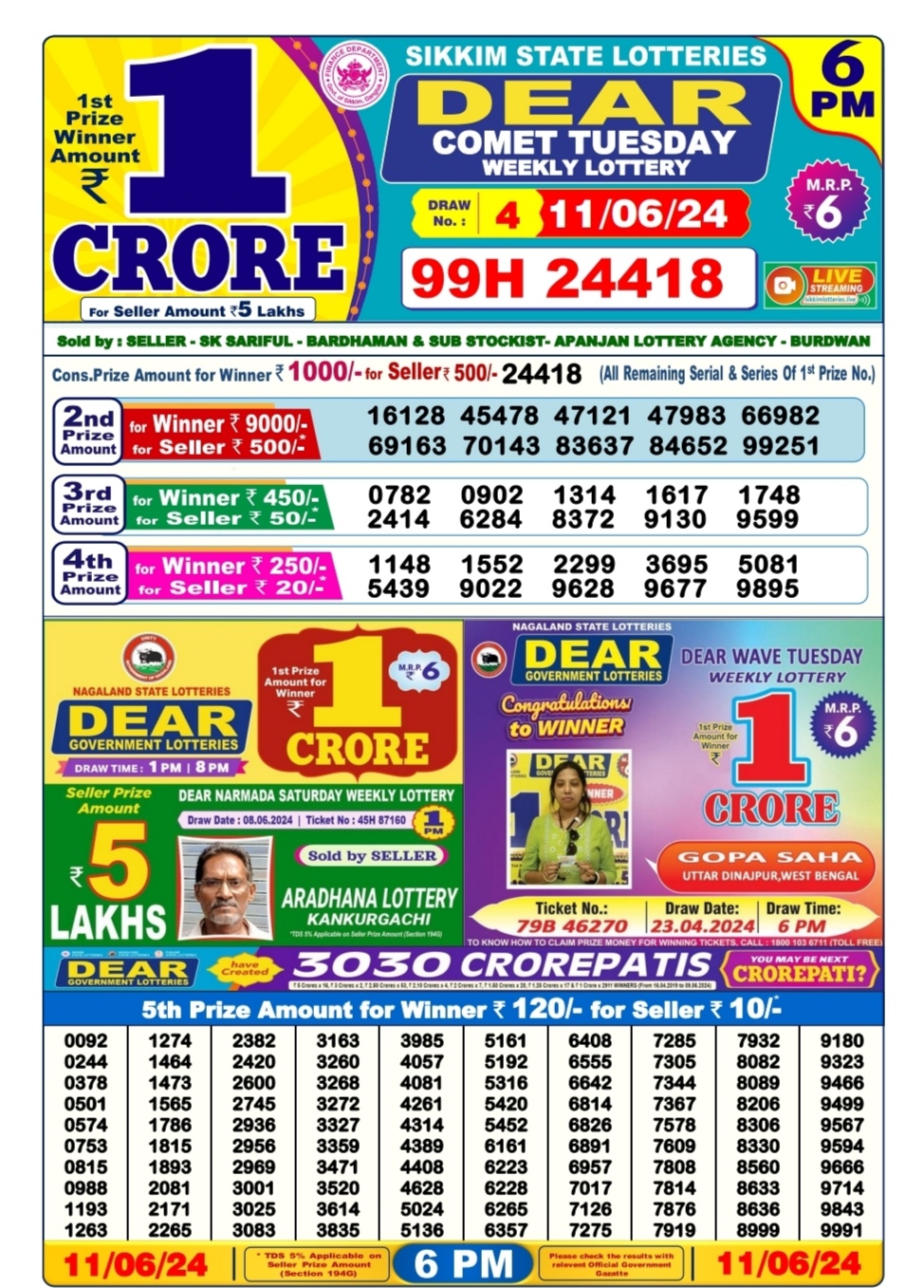 Dear dwarka Monday Weekly lottery 1pm result 10/06/24