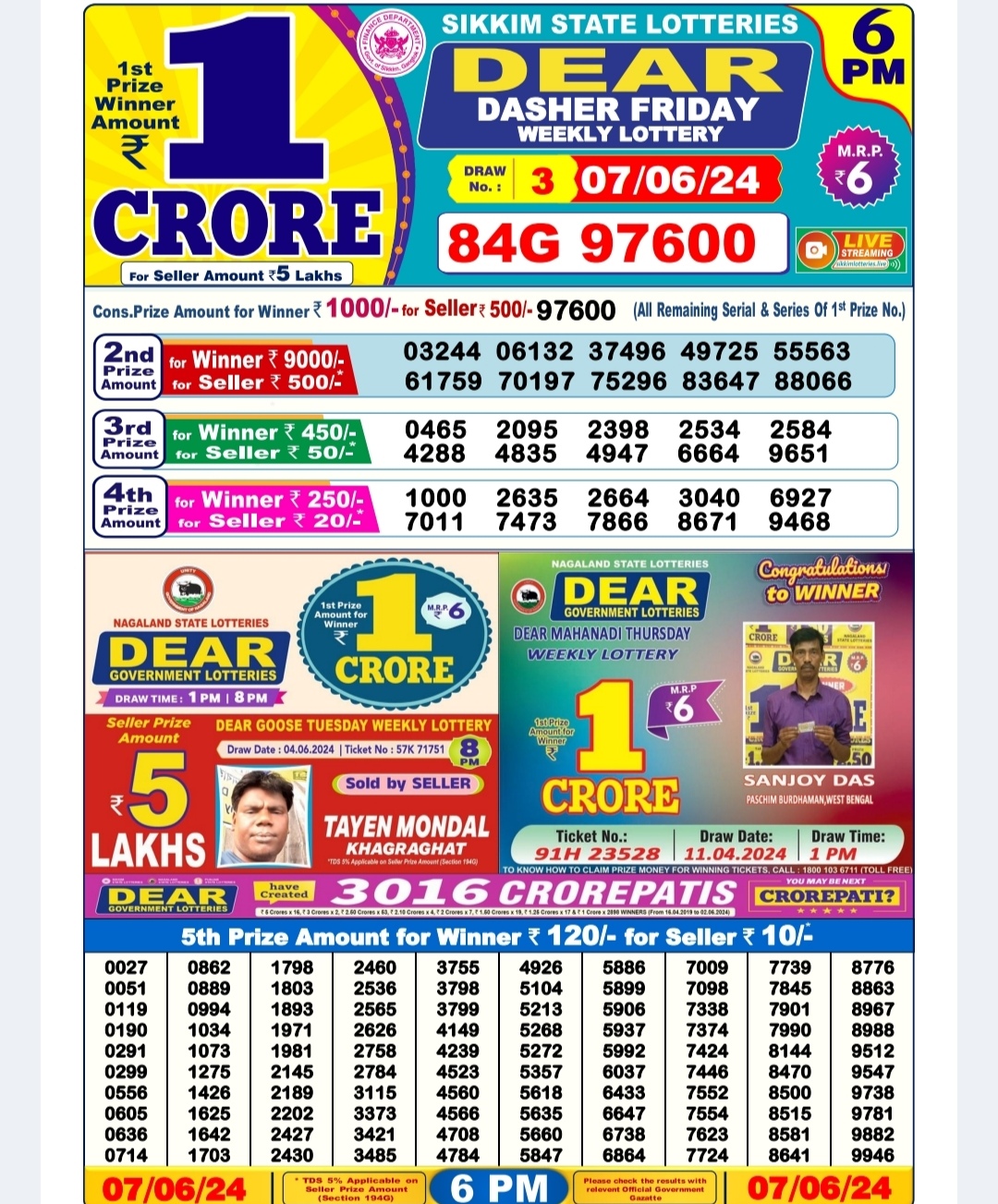 Dear10 super Friday weekly lottery 7pm result 7/06/24