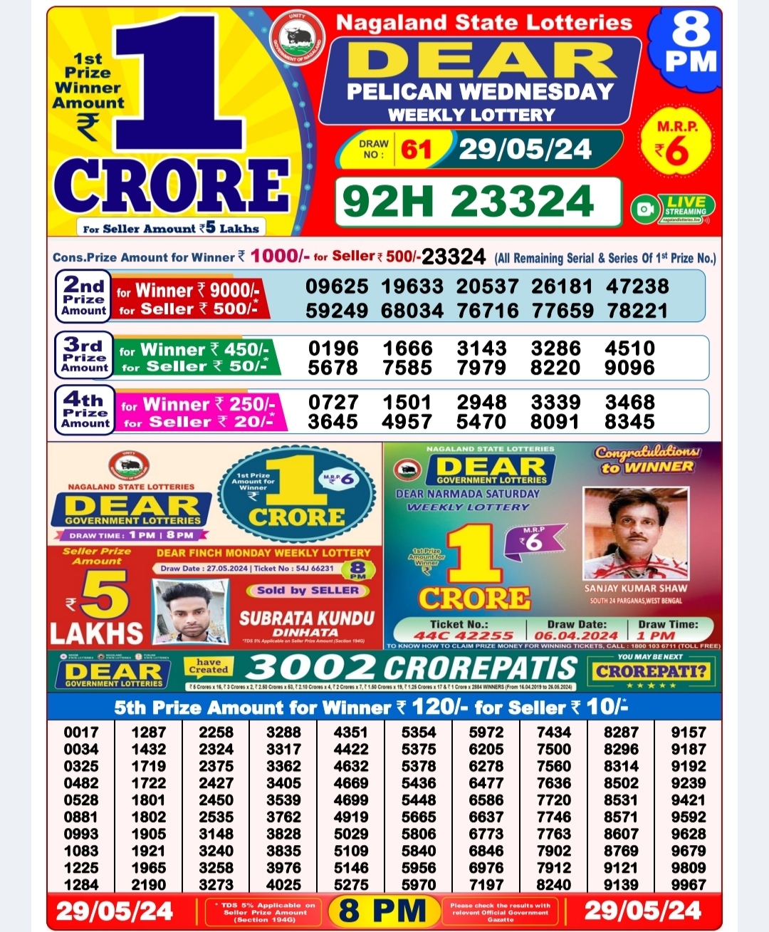 Dear indus Wednesday weekly lottery 1pm result 29/05/24