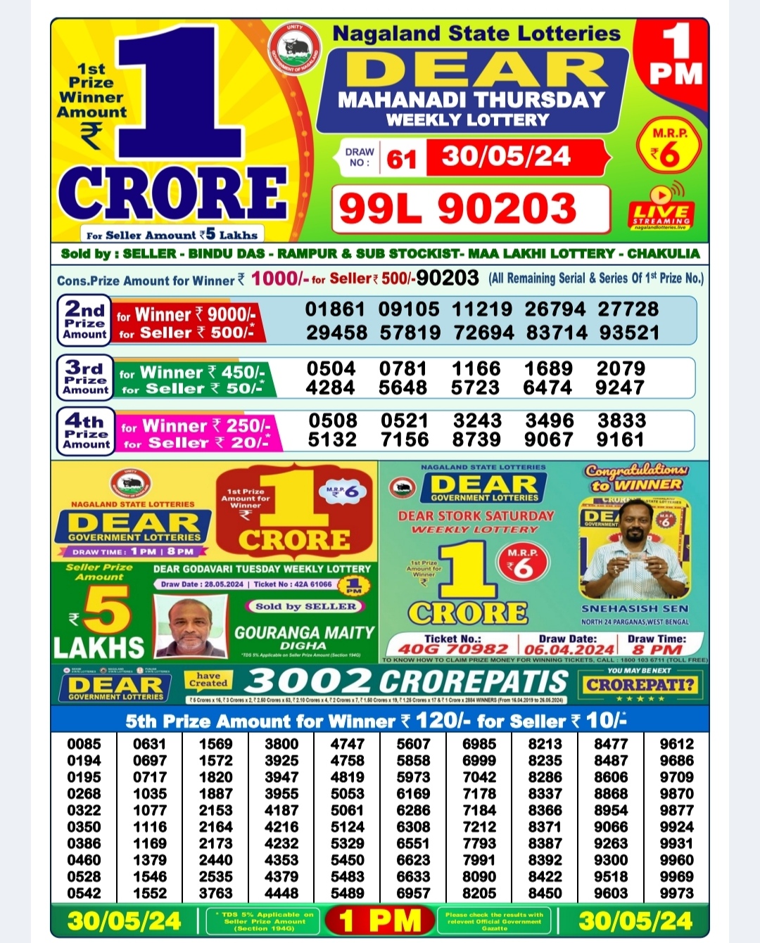 Dear mahanadi Thursday weekly lottery 1pm result 30/5/24