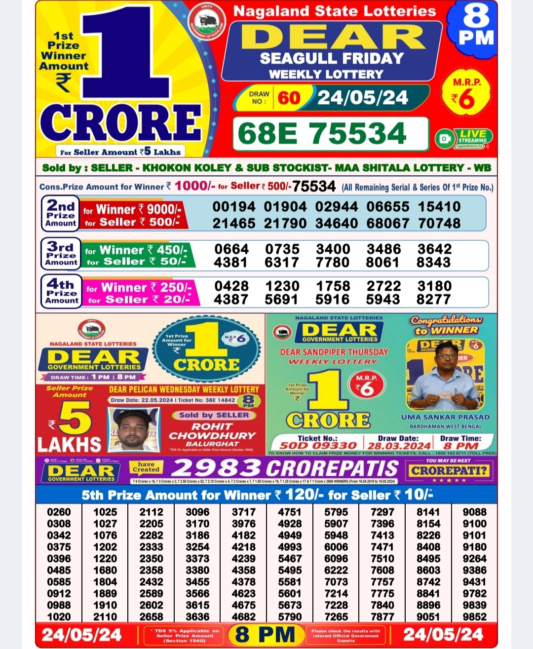 Dear seagull Friday weekly lottery 8pm result 24/05/24