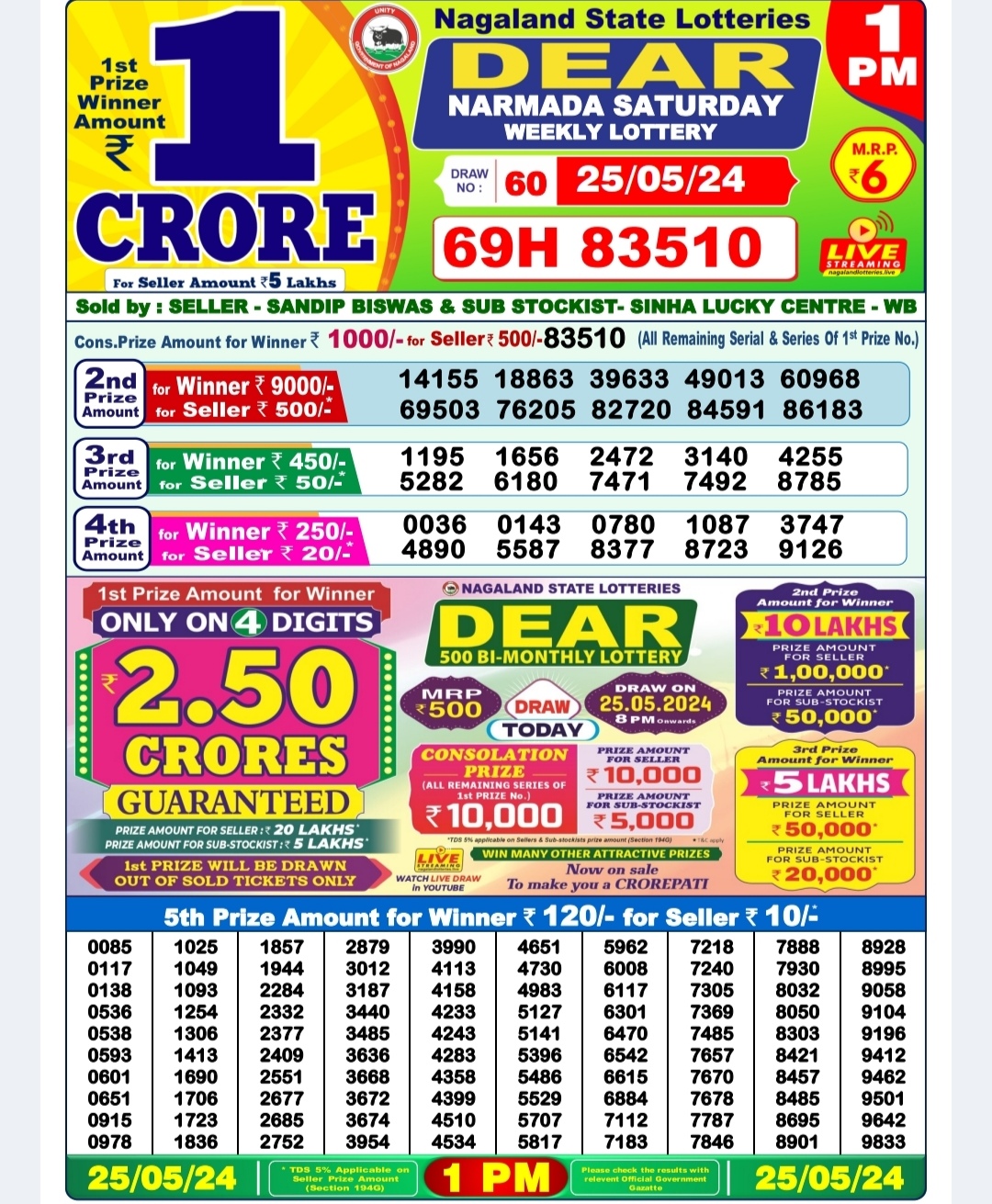 Dear narmada saturday weekly lottery 1pm result 25/05/24