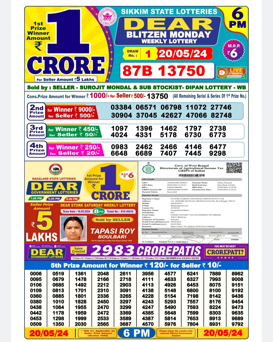 Dear10 firm lottery 7pm result 20/05/24