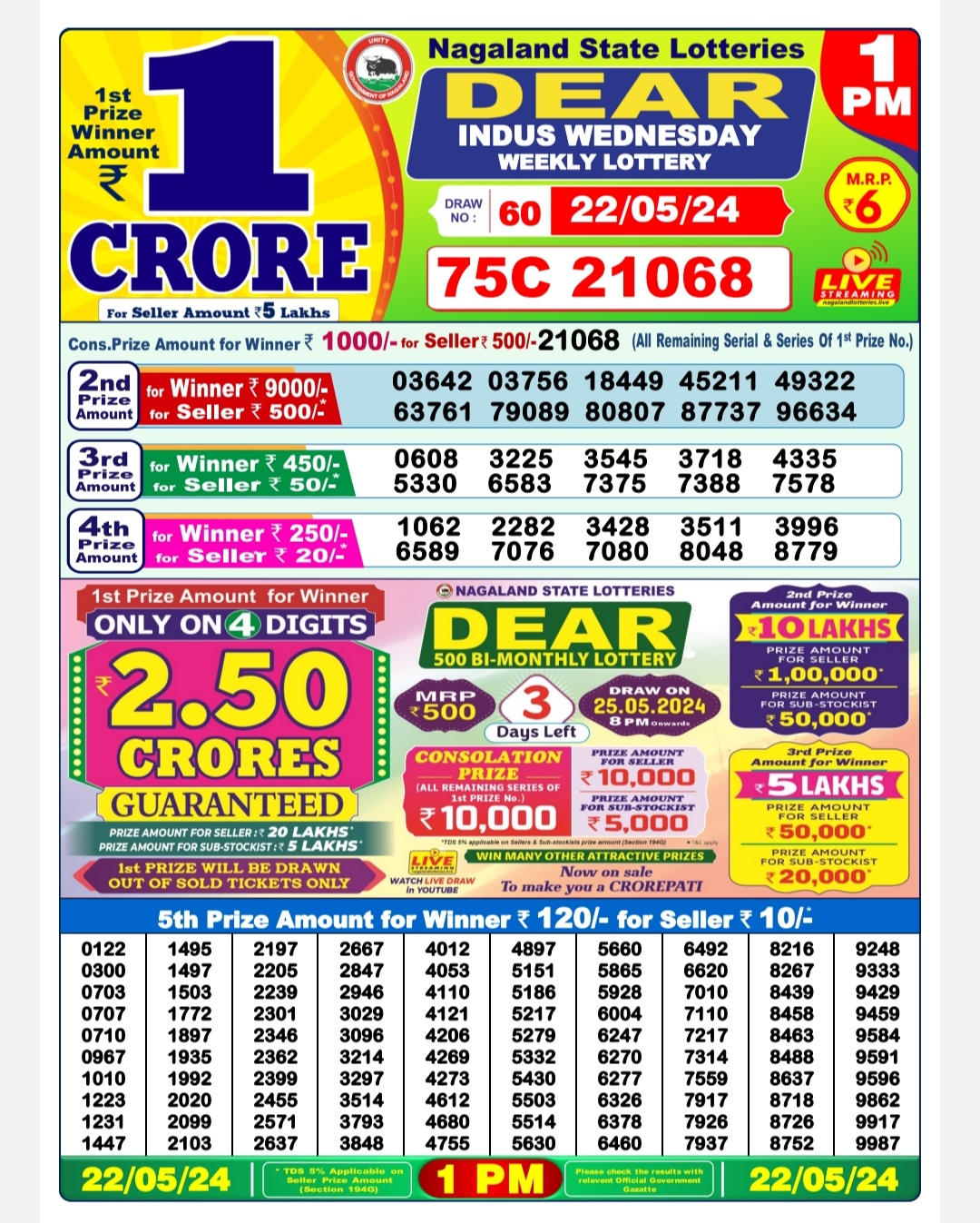 Dear indus Wednesday weekly lottery 1pm result 22/05/24