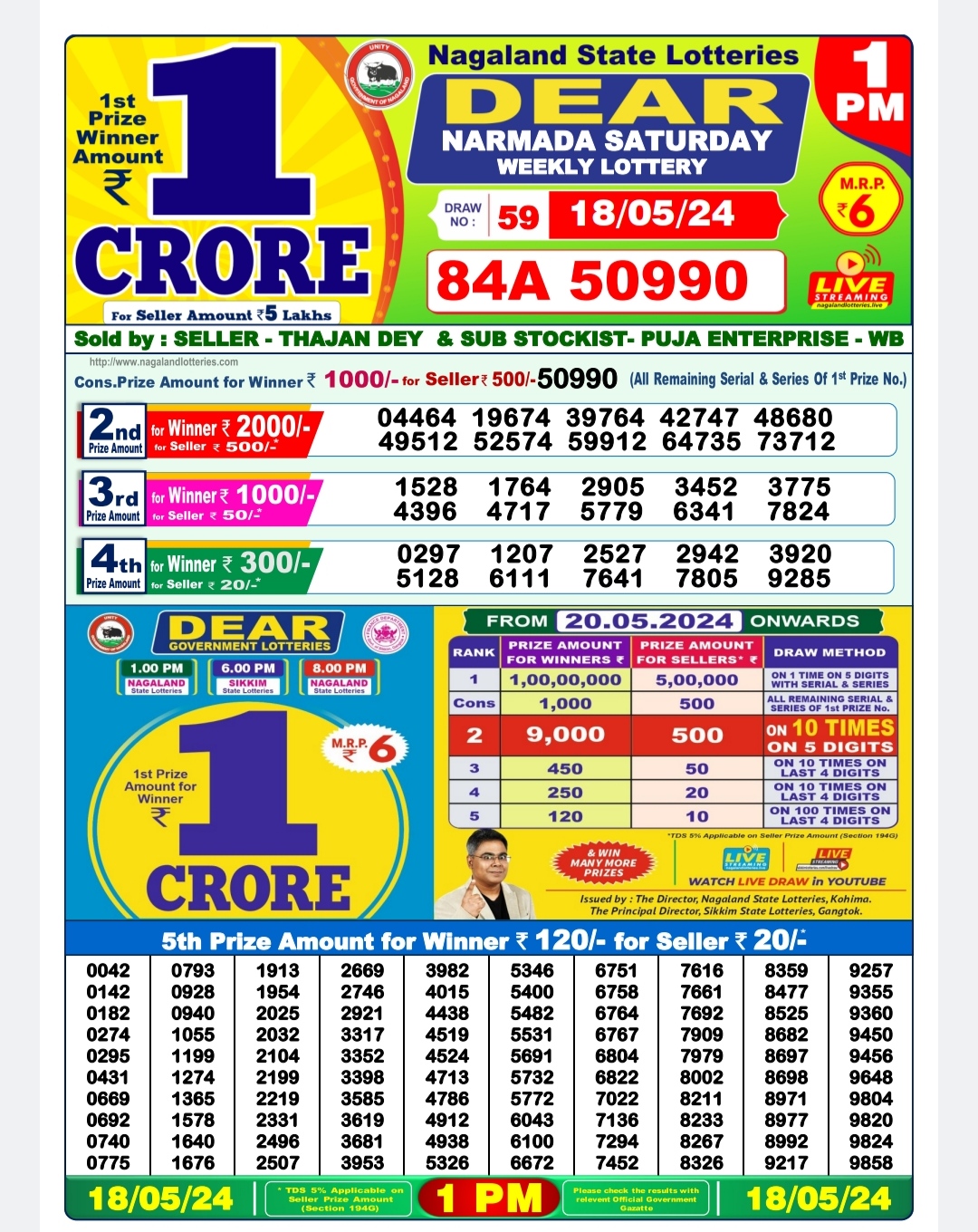 Dear narmada saturday weekly lottery 1pm result 18/05/24