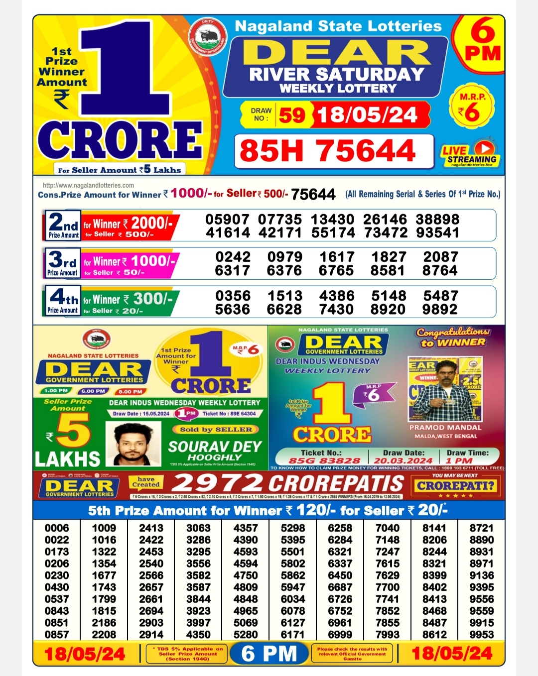 Dear river saturday weekly lottery 6pm result 18/05/24